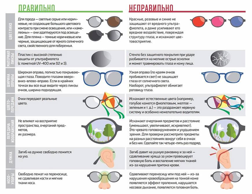Глаза от солнцезащитных очков болят в тех случаях, когда оправа подобрана неправильно или выбрана модель с некачественными линзами. Приобретать подобную оптику следует в специализированных магазинах. Стекла не обязательно должны быть темными. Главное, чтобы они были оснащены фильтрами, блокирующими ультрафиолет. Идеальный вариант — серые или коричневые линзы. Синие и фиолетовые увеличивают нагрузку на глаза. Длительное ношение таких очков может вызвать дискомфорт.