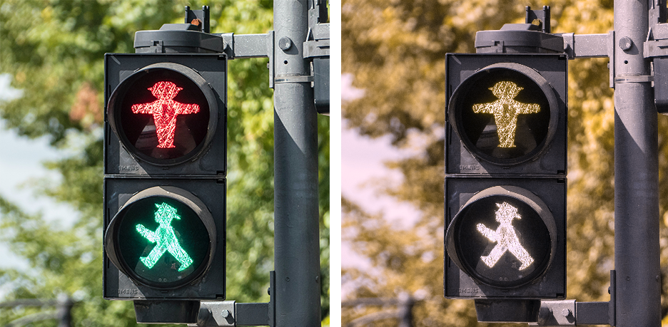 Также на фото выше можно заметить, что зелёный ⬤ цвет сигнала светофора выглядит как светло-розовый ⬤. Но для людей с зелёным дальтонизмом серый тоже кажется розоватым, поэтому для них ⬤, ⬤ и ⬤ выглядят одинаково — как оттенки серого.