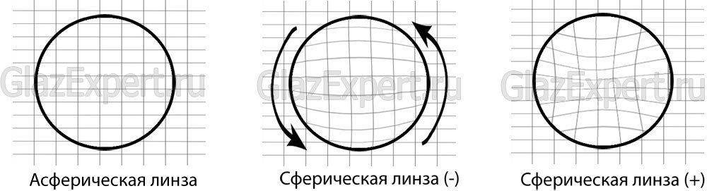 Сферические имеют две выпуклые поверхности. У них сильное искажение и плохая периферическая видимость. Асферические -тоньше, меньше, прочнее. Периферия более четкая, меньше искажений. Лентикулярные — по центу зона с оптической силой, периферия служит ее основой. Их применяют при серьезных нарушениях зрения с диоптриями, которые слишком велики.