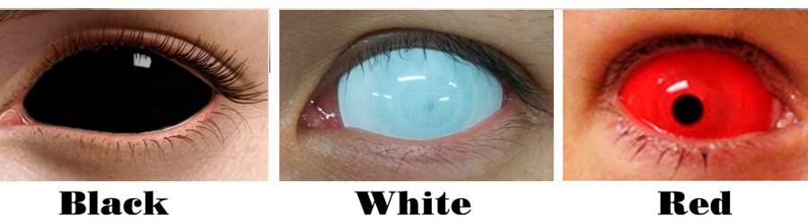Часто в кино и различных постановках можно наблюдать красные, белые, а также самую распространенную разновидность такой оптики — черные склеральные линзы.