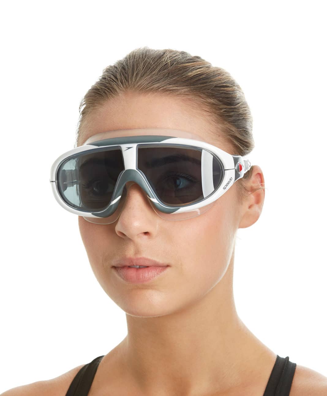 Очки-маска отличаются большими линзами, обеспечивающими широкий угол обзора. Ободок и ремешок аксессуара чаще изготавливается из силикона. Но благодаря большой ширине изделия, маска надавливает лицо пловца не столь интенсивно как модели тренировочных очков.