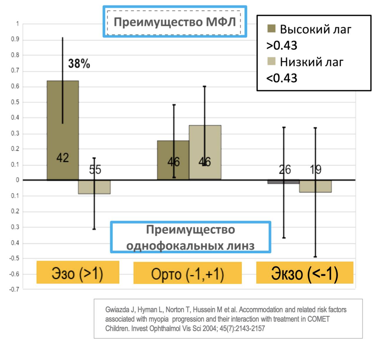 - В подгруппе с эзофорией и высоким ЛАГ аккомодации эффект 38%