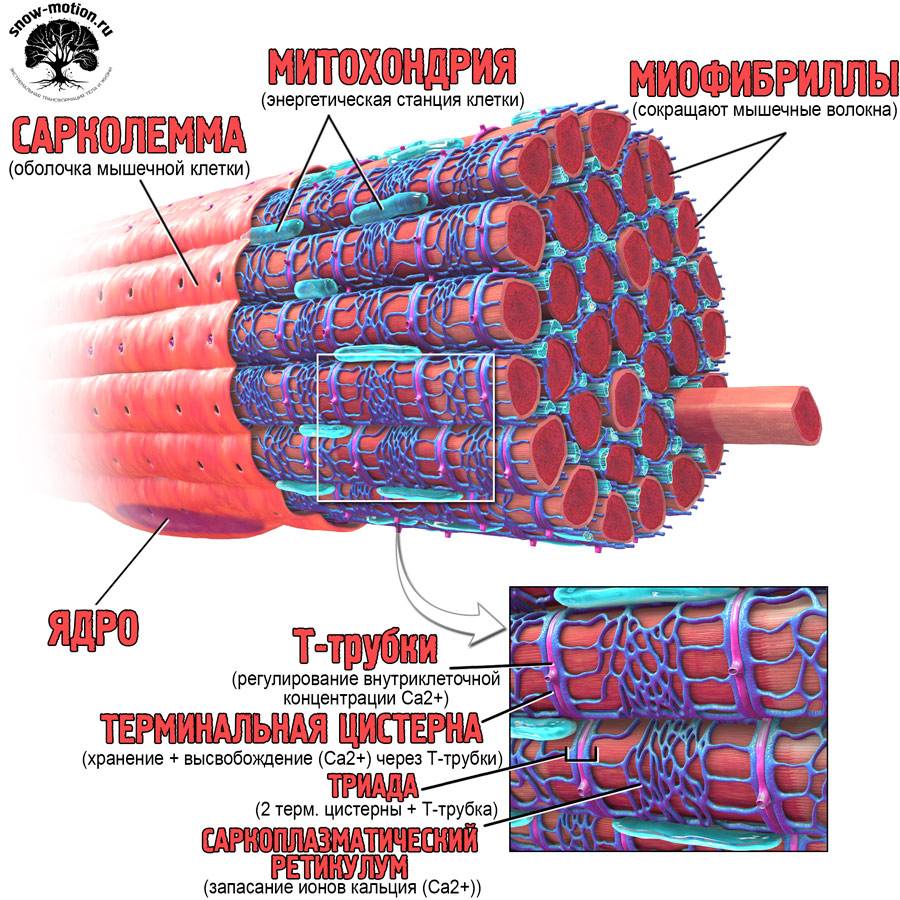Благодаря такому сложному строению каждое мышечное волокно способно выдерживать серьезные нагрузки. Сила мышц зависит от количества миоцитов, а также от входящих в их состав микроэлементов.