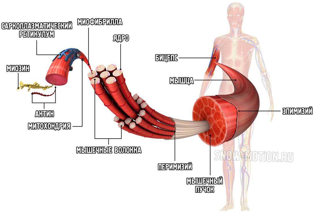 Оболочка мышечных волокон покрыта миофибриллами. От их количества зависит скорость сокращения мышц и их сила. Тренировки приводят к увеличению толщины и количества миофибрилл. При росте их в 2 раза сила мышцы возрастает в 3 раза.