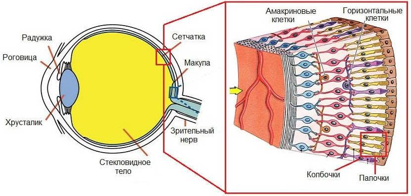 Сетчатая оболочка у людей является сложной структурой, состоящей из одиннадцати слоев нервных клеток. Ею не захватывается передняя камера глаза, и она располагается за хрусталиком. Верхний слой составляется из светочувствительных клеток – из колбочек и палочек.